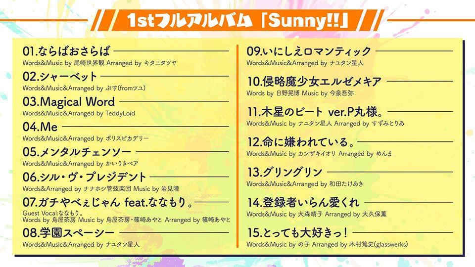 記念すべき初のフルアルバム「Sunny!!」には”超歌手”大森靖子、ミュージシャンとしてだけではなく執筆活動でも注目を集めるクリープハイプのVo./Gt. 尾崎世界観、楽曲とライブパフォーマンスが常に話題になるインターネットポップロックバンド神聖かまってちゃん、その幅広い音楽性で世界的に活動しているTeddyLoidなど豪華クリエイター陣が集結。