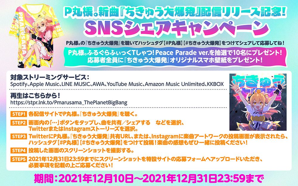 デジタル配信リリースを記念してSNSシェアキャンペーンもスタート。「ちきゅう大爆発」を再生してSNSで共有/シ ェアして応募すると抽選で10名様に「P丸様。ふるぐらふぃっくTしゃつ!Peace Parade ver.」が当たるというものだ。 また応募者全員には「ちきゅう大爆発」のオリジナルスマホ壁紙がプレゼントされる。 TikTok配信は12月11日(土)0時から開始されるので、「シル・ヴ・プレジデント」「ときめきブローカー」など投稿され ている多くの楽曲と同様にぜひ「ちきゅう大爆発」でも楽しい動画のシェアを楽しんで欲しい。