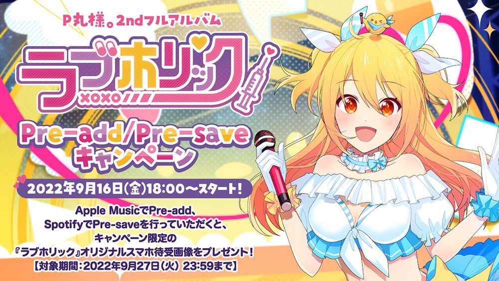 9月16日(金)18:00より、P丸様。の2ndフルアルバム『ラブホリック』をApple MusicでPre-addまたはSpotifyでPre-saveをするとキャンペーン限定の『ラブホリック』オリジナルスマホ待受画像がもらえるキャンペーンが開始!